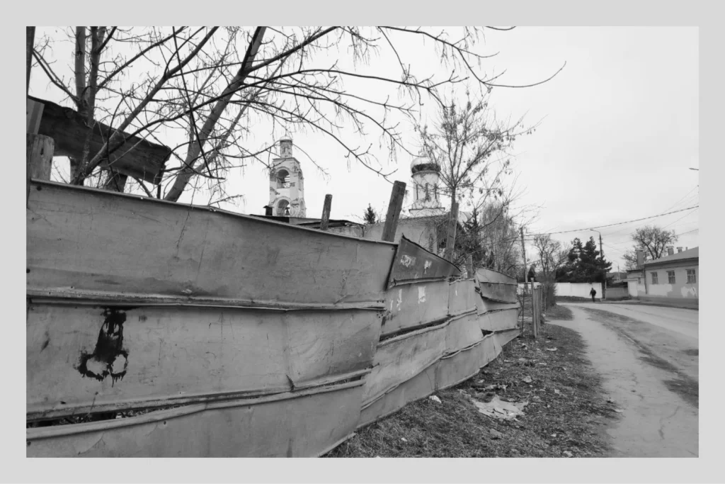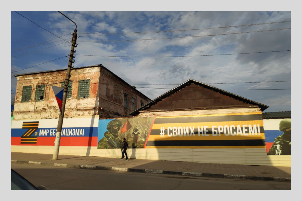 Ефремов — небольшой райцентр в Тульской области. Здесь живут немногим больше 30 тысяч человек. В центре — площадь, которая называется Красной, благоустроенная в модном московском духе за 90 млн рублей. На углу площади — развалина купеческого особняка, дома Деревенёва, у которого уже обрушилась крыша и рушатся стены. Сейчас руина спрятана за огромным баннером с надписью «Сила V правде», изображениями солдат и стихами «Добро должно быть с кулаками».