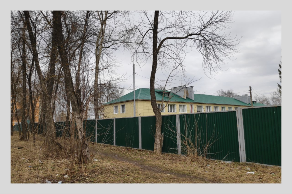Деревянная постройка обнесена двухметровым металлическим забором. На запертых воротах — объявление об аренде и продаже с телефоном Москалёва (такой же номер указан в судебных документах по его делу).