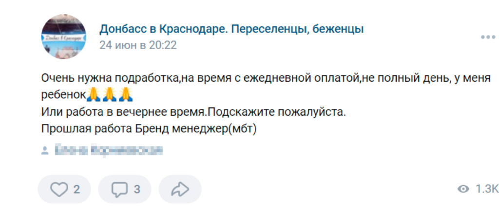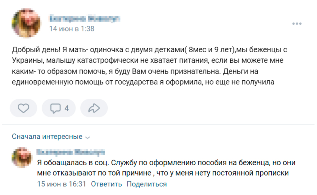 Жительница так называемой ДНР, которая приехала в Россию с сыном и дочерью, в своём посте рассказывает, что они «остались без ничего, лишились крыши над головой». Она просит помочь ей продуктами, детской одеждой и памперсами «для дочурки». Другая женщина — из Горловки — пишет, что ей нужна обувь для ребёнка, посуда, бытовая химия и лекарства. Женщина с двумя детьми из Донецка «очень нуждается» в «стареньком чайнике», кастрюле, доске для резки и швабре. Ещё одна мама из ДНР просит подгузники и стерилизатор для бутылок и обещает показать документы, подтверждающие, что она не мошенница.