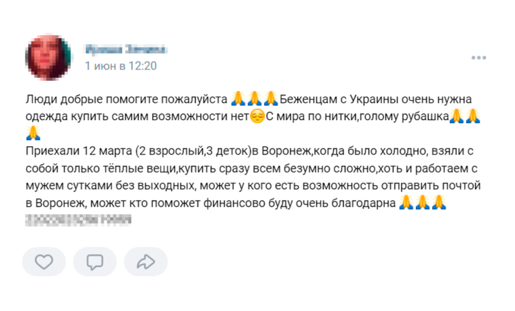 В российских сообществах помощи беженцам в соцсетях появляется много постов, опубликованных женщинами с детьми, прибывшими из Украины. Они пишут, что нуждаются в жилье, детских вещах, продуктах, мебели, бытовой технике, лекарствах, книгах для школьников. Многие посты начинаются словами: «Помогите, пожалуйста, чем можете».