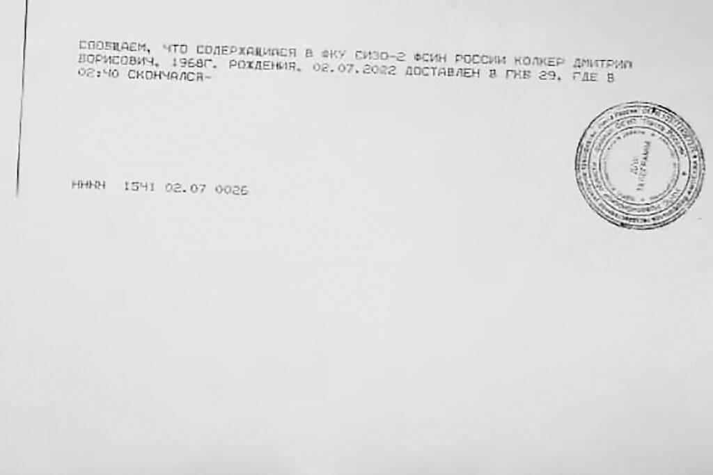 Второго июля Дмитрий Колкер умер. Его семье сообщили об этом с помощью телеграммы. Близкие так и не смогли увидеться с ним перед смертью.