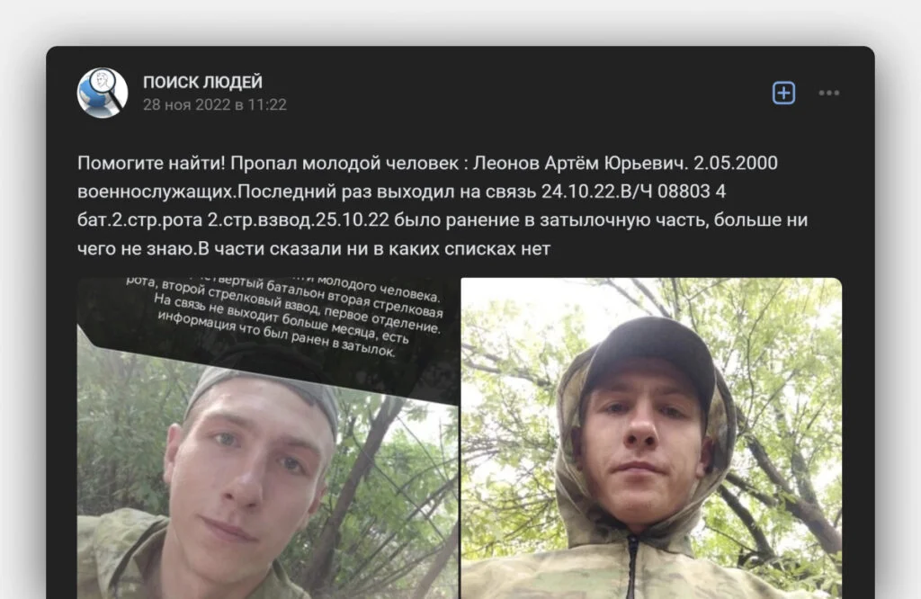 С весны в социальных сетях стали появляться объявления о розыске пропавших мужчин, воевавших в Украине на стороне России. Ищут их в основном женщины — жёны, матери, дочери, племянницы. «Вёрстка» обнаружила в тематических группах во «ВКонтакте» десятки таких постов. Большинство из них размещены жительницами самопровозглашённых ДНР и ЛНР. Они ищут мужчин, служивших в местных воинских частях.