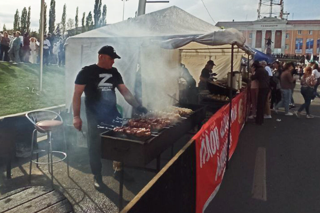 Пройдя досмотр, несколько десятков женщин и мужчин среднего возраста не пошли к сцене, а отправились покупать шашлык и сладости. Палатки с шашлыком по 200–300 рублей за порцию и леденцами на палочке поставили специально для участников концерта.