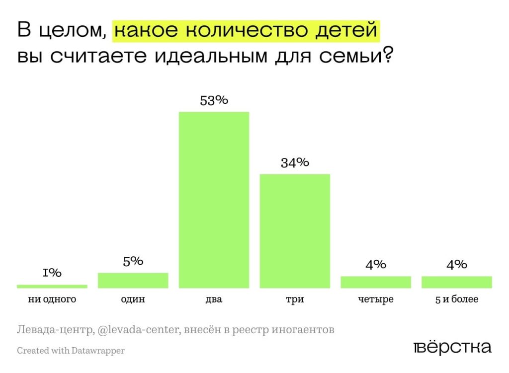 5% россиян считают, что в идеальной семье должен быть один ребенок, чуть более половины — двое детей, треть — трое, ещё 8% респондентов идеальной считают семью с четырьмя и более детьми. Отсутствие детей идеальным назвали 1% россиян.