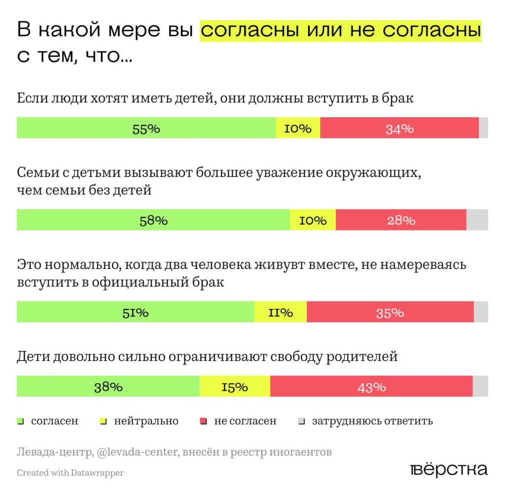 «Левада» утверждает, что россияне придерживаются скорее традиционных взглядов на семью, брак и гендерные роли. При этом в исследовании прослеживается поколенческий разрыв, связанный с размыванием поддержки социального института официального брака среди россиян 18–39 лет.