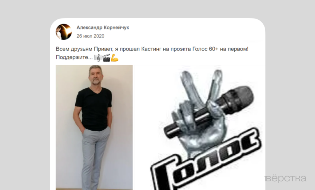 Примечание «Вёрстки»: пока мы писали этот материал, владелец страницы с именем Vovan Mois переименовал аккаунт. Новое имя — Саша Корней. В качестве изображения профиля теперь стоит настоящее фото Корнейчука. Он также изменил дату рождения, город проживания, поставил профессию «музыкант» и удалил часть постов, в том числе запись про «дружбу» с девушкой 13–15 лет. У редакции остались скриншоты.