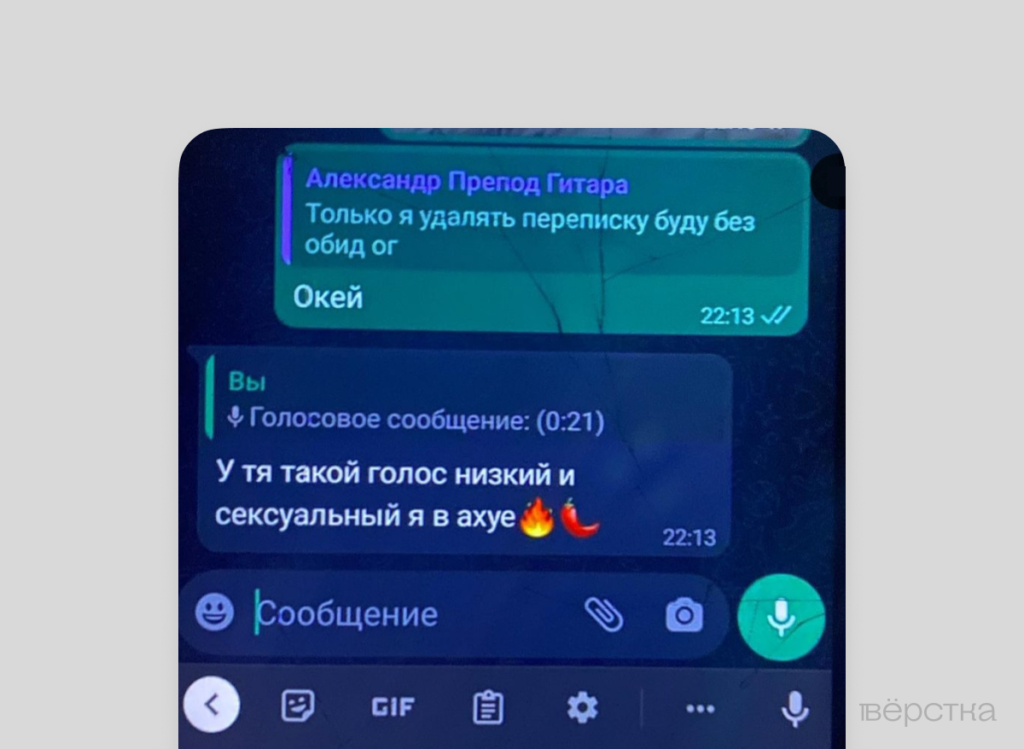 На следующей неделе Настя несколько раз пыталась вернуться к этому разговору. В итоге выяснилось: примерно год назад её младшая сестра, которой тогда было 11 лет, регулярно переписывалась с 65-летним Александром Корнейчуком — учителем, к которому она ходила на кружок по гитаре. Эта коммуникация была для неё очень болезненной, и девочка ушла из кружка, а кроме того бросила и все свои остальные хобби.