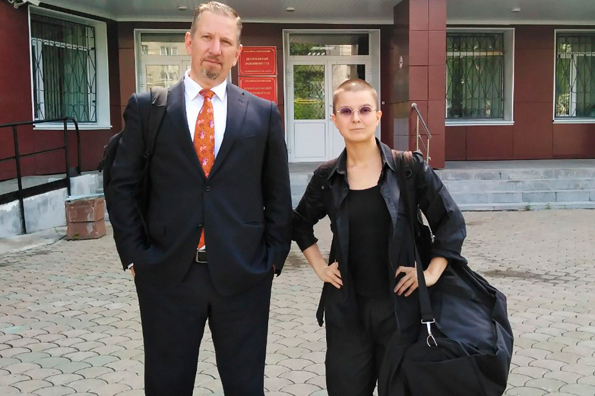 Фото обложки: Юлия Цветкова с адвокатом Александром Пиховкиным у здания суда из telegram-каналa «Я/Мы Юлия Цветкова»