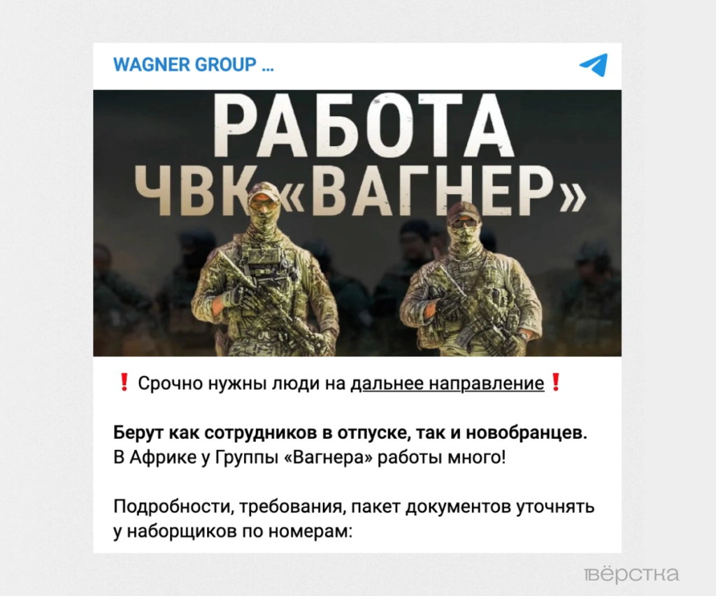 Последний набор в Африку стал самым массовым за всю публичную деятельность ЧВК «Вагнер» — его ведут сразу десять рекрутёров по десяти номерам. Ранее новобранцев набирали через один-два номер телефона, а единичные объявления об этом публиковали в профильных группах во «ВКонтакте». Теперь же за один только месяц в основном телеграм-аккаунте организации появилось более 18 постов. Кроме того, призывы присоединиться к группировке в личных аккаунтах публиковали и сами «сотрудники» ЧВК. (Напомним, ранее «Вёрстка» уже писала, что каждый третий «рекрутёр» «Вагнеров» имеет судимость).