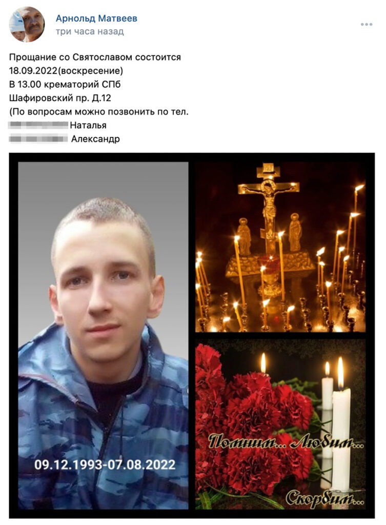 В минувшее воскресенье корреспондент «Вёрстки» пришёл в петербургский крематорий на Шафировском проспекте под видом одного из друзей Матвеева. Вместе с ним на прощании побывало около 20 человек: родственники погибшего в Украине бойца, его друзья и несколько мужчин, очень похожих на представителей криминального мира.