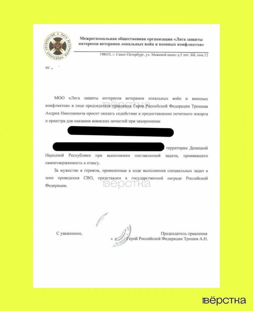 Представители ЧВК «Вагнера» начали распространять по местным администрациям письма с требованием предоставлять на похоронные церемонии своих бойцов «почётный эскорт» и «оркестр». Обращение отправляется от имени одного из руководителей ЧВК Андрея Трошева, которого представляют как Героя России и лидера близкой Евгению Пригожину общественной организации «Лига защиты интересов ветеранов локальных войн и военных конфликтов». В случае отказа со стороны местных властей представители ЧВК просят родственников погибших «присылать данные» не пошедших на сотрудничество чиновников.