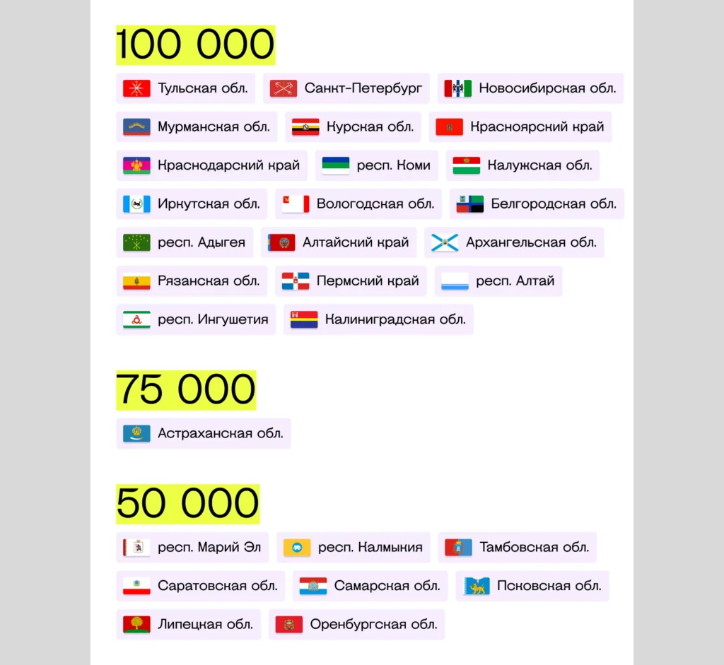 Также по 50 тысяч рублей выплатят в Калмыкии, а также Саратовской, Самарской, Псковской, Липецкой, Оренбургской и Тамбовской областях.