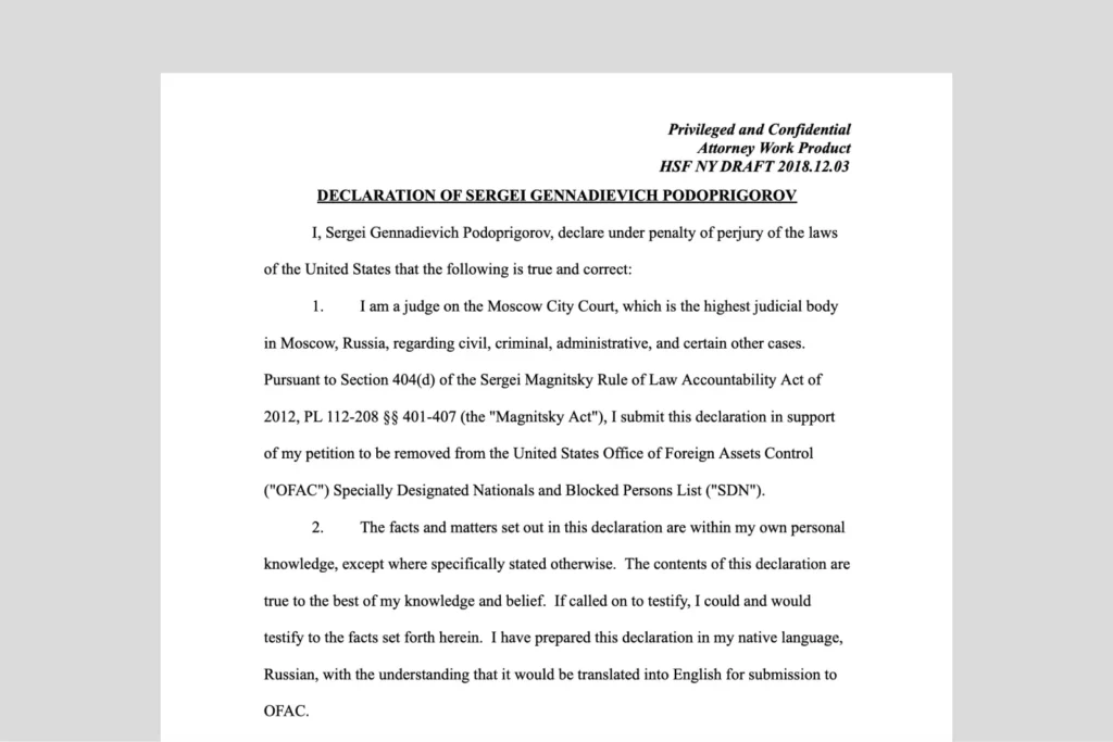 Судья Мосгорсуда Сергей Подопригоров, который сейчас слушает дело о госизмене и «фейках» об армии в отношении политика Владимира Кара-Мурзы, в 2018 году подал в министерство финансов США прошение исключить его из санкционного «списка Магнитского». Черновик письма Подопригорова есть у «Вёрстки», его предоставил адвокат Кара-Мурзы Вадим Прохоров.