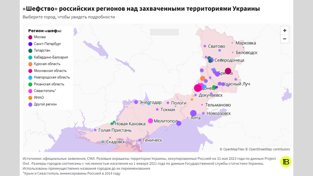 Брать захваченные территории Украины под «шефство» российские регионы начали ещё весной прошлого года. «Разнарядки» из Кремля по распределению «подшефных» регионов совмещались с инициативами на местах. По словам источников «Вёрстки» в полпредствах, прямого принуждения не было, но рекомендации губернаторам взять под крыло ту или иную территории не оспаривались. Некоторые главы, вроде чиновников из «тюменской матрёшки» — Тюменская область и входящие в неё нефтедобывающий ХМАО и газодобывающий ЯНАО — якобы «пытались хитрить» и выбирать наименее пострадавшие территории. Но, судя по тому, что Ямал в итоге курирует до основания разрушенную во время боёв Волноваху («ДНР») и её окрестности, хитрость не удалась.