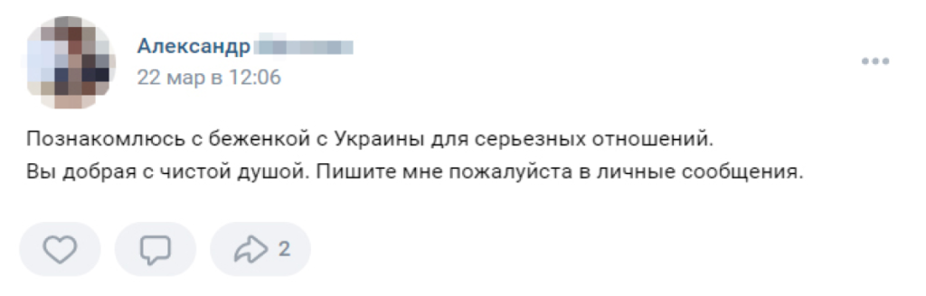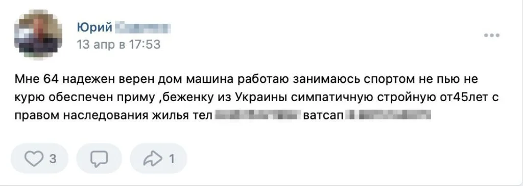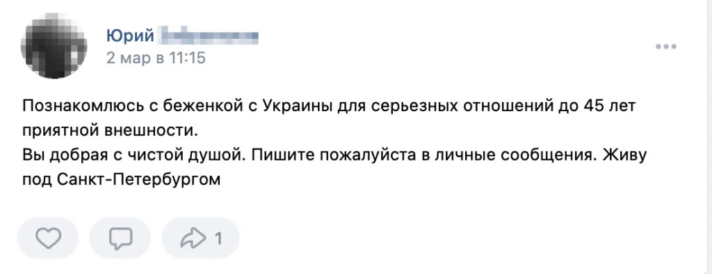 The posts showed up in both regional groups, such as «Settlers and Refugees in Kaluga» and «Helping Refugees in Saint Petersburg,» and in national online communities. In one popular group, called «Ukrainian Refugees,» which boasts nearly a thousand members, the first ads appeared in late February. In May, twenty-two men had authored posts offering to help Ukrainian women.