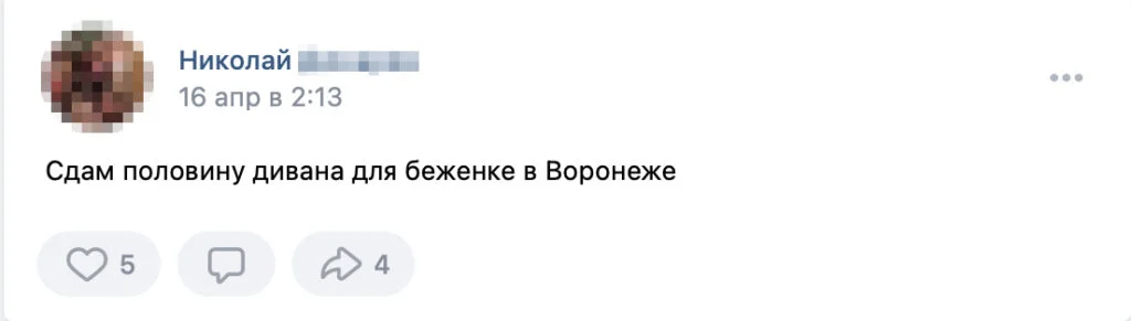 Since 2014, numerous social media groups have formed on VKontakte with the purpose of unifying residents of Donetsk and Luhansk People’s Republics. Right after the 2022 invasion, users became more active, and many new posts appeared. As Ukrainian refugees started arriving in Russia in the first half of February, they appealed to Russians for help, seeking housing, medication, clothing, and documents. Meanwhile, Russian men started posting in relief forums, offering their assistance — but only to women. We counted more than a hundred such posts. Some of them simply offered to meet with Ukrainian women, as if on a dating site.