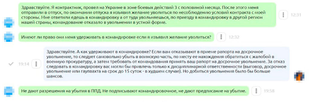 Мария Вьюшкова — эксперт фонда «Свободная Бурятия», который регулярно консультирует военнослужащих, желающих расторгнуть контракт. Она рассказывает, что часто люди, желающие отказаться от военной службы, также сталкиваются с угрозами со стороны командования. Например, им обещают отдать военный билет с записью «Склонен к измене, лжи и обману» и говорят, что с такой отметкой после увольнения они не смогут устроиться даже на гражданскую работу.