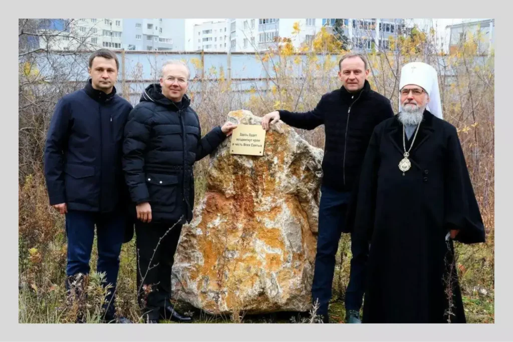На табличке камня есть надпись: «Здесь будет возведён храм в честь всех святых». Так жители Уфы узнали, что рядом с останками средневекового башкирского города хотят построить православное религиозное здание. С камнем в день его установки сфотографировались уфимский митрополит Никон и башкирские чиновники — премьер-министр республики Андрей Назаров и бывший руководитель администрации главы Башкортостана, автор закона об иностранных агентах Александр Сидякин.