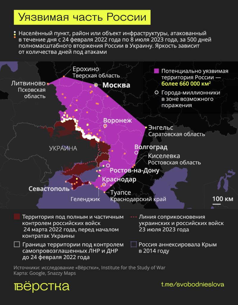 К 8 июля — 500-му дню войны — под атаки попали минимум 266 российских населённых пунктов. В том числе два города федерального значения — Москва и аннексированный Севастополь, — а также города, сёла, хутора, станицы и деревни в 16 регионах и аннексированном Крыму.