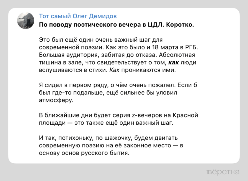 Z‑поэты очень активны онлайн: они постоянно делятся текстами друг друга, регулярно анонсируют своё участие в тех или иных встречах и мероприятиях, обсуждают прошедшие выступления, и может показаться, что их популярность очень быстро набирает обороты, а их творчество и выступления — хорошо оплачиваются. За комментариями «Вёрстка» обратились к этим поэтам и участникам книжного рынка.