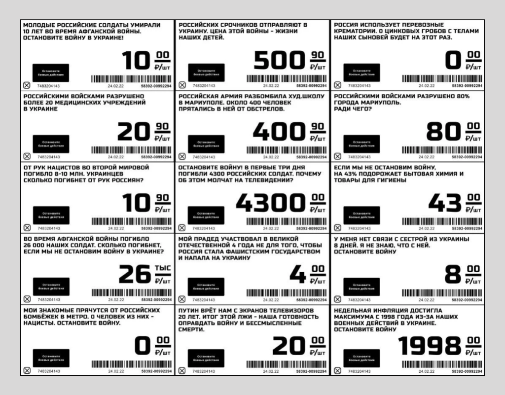 Макеты антитвоенных ценников. Источник: Феминистское антивоенное движение