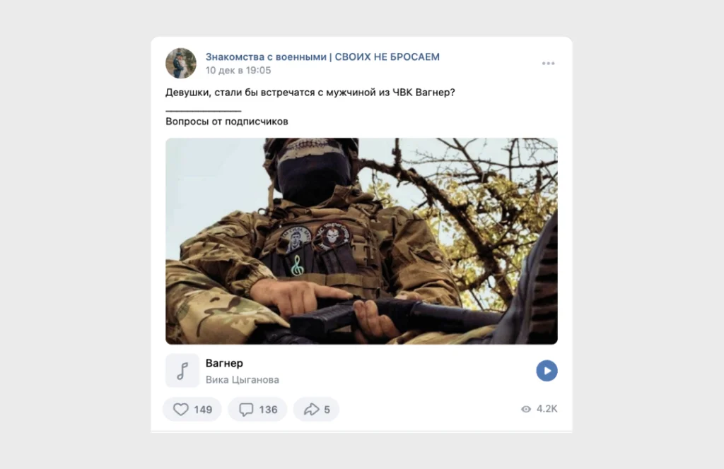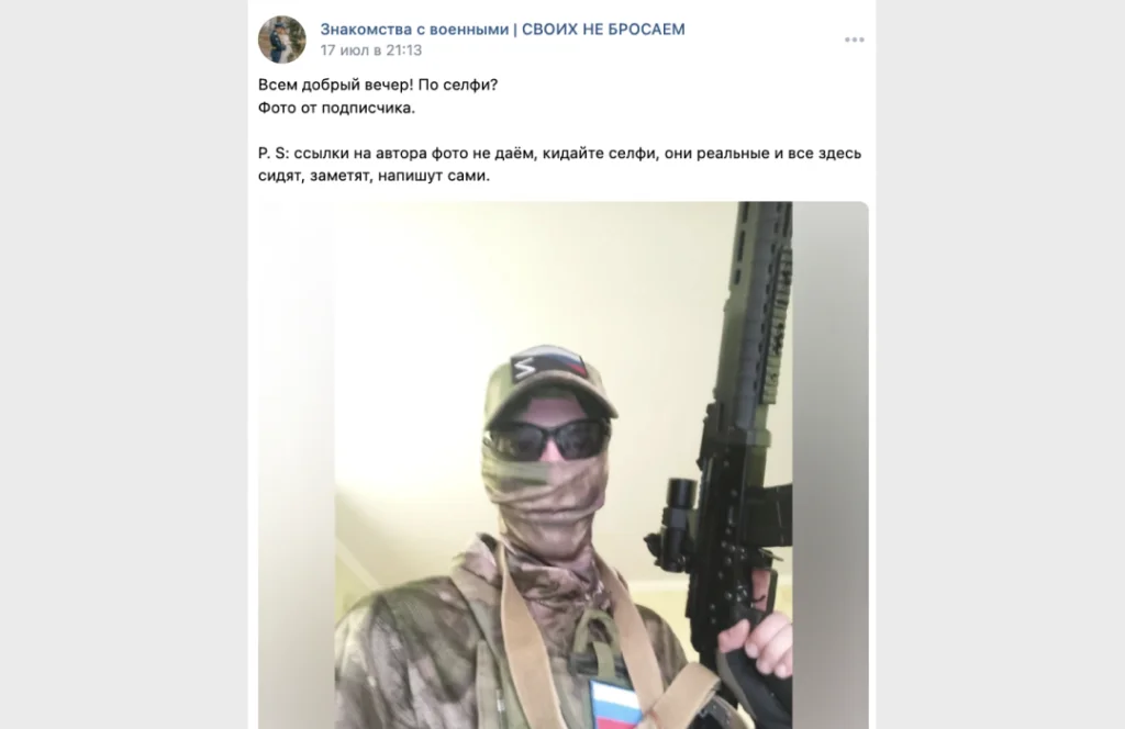 На фоне войны во «ВКонтакте» стали активно развиваться сообщества, где россиянки пытаются познакомиться с военными. «Вёрстка» нашла около 30 таких групп, в самой многочисленной — 23 тысячи участников. С весны в ней каждый день появляются десятки постов от женщин из разных регионов. Они публикуют свои фотографии и рассказывают, как далеко готовы уехать за военнослужащим, какими качествами должен обладать их будущий супруг и к какому военному подразделению он должен принадлежать. О себе и о своих требованиях к женщинам в группе пишут и сами военные.